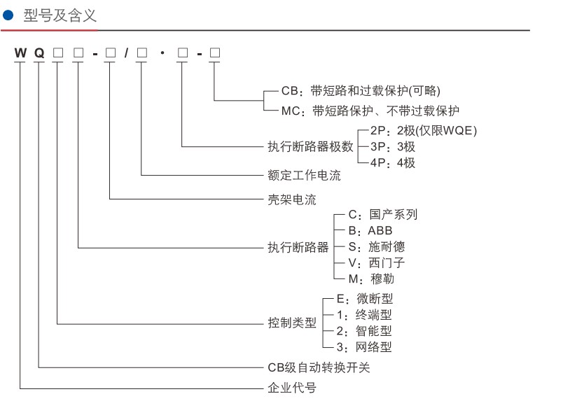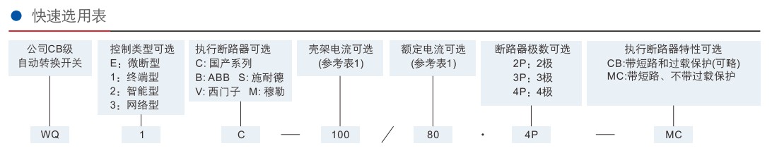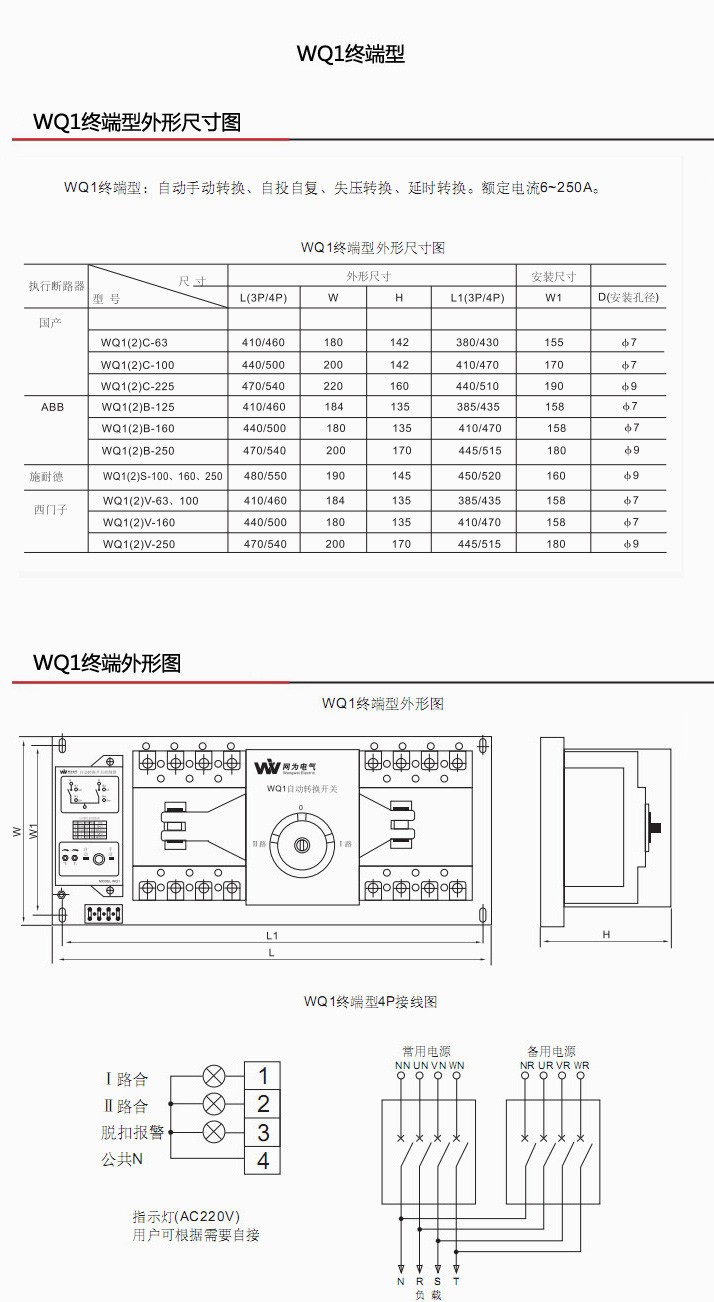 5、WQ1微斷型控制器主要功能:自動手動轉換、自投自復、失壓轉換、延時轉換,額定電流6~250A。