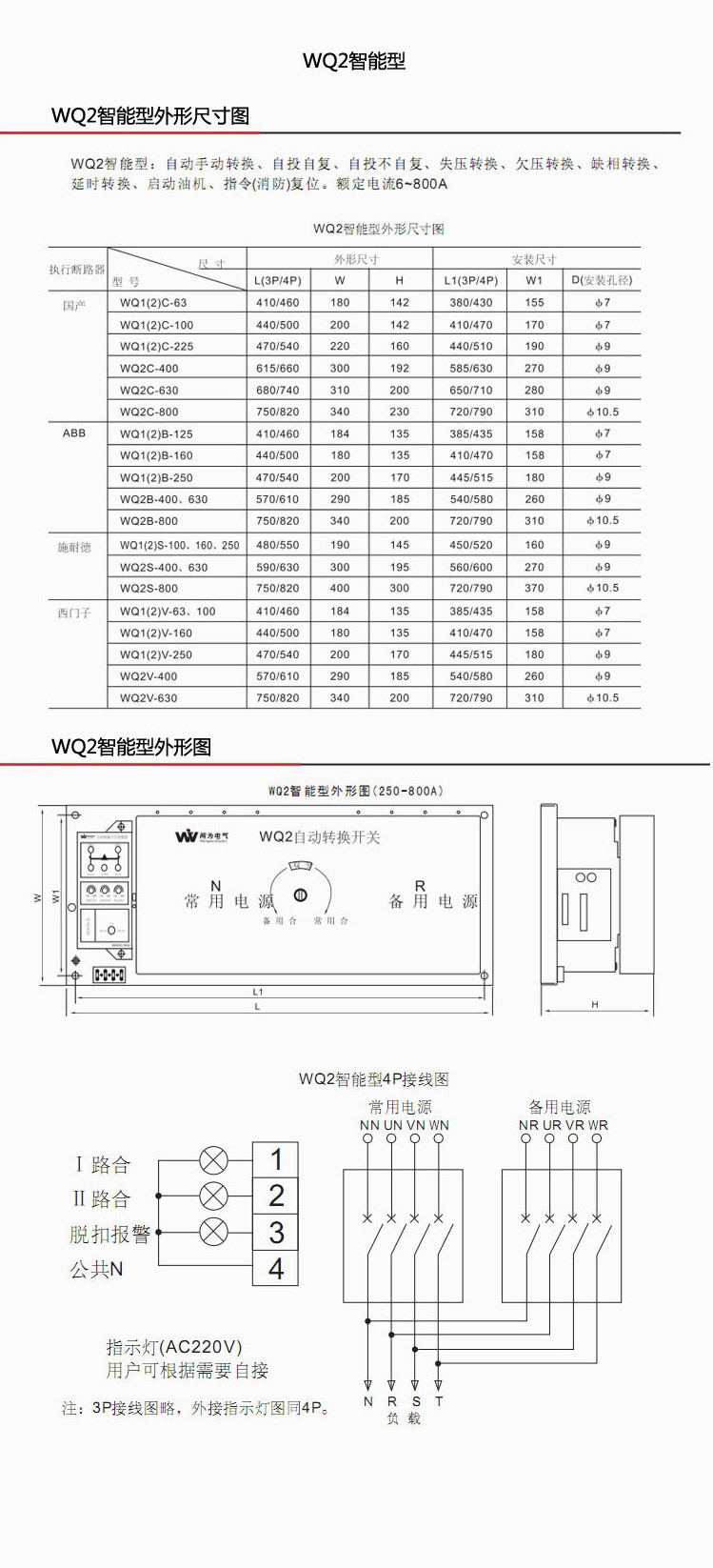 5、WQ2智能型控制器主要功能:自動手動轉換、自投自復、自投不自復、失壓轉換、欠壓轉換、缺相轉換、延時轉換、啟動油機、指令(消防)復位,額定電流6~800A。